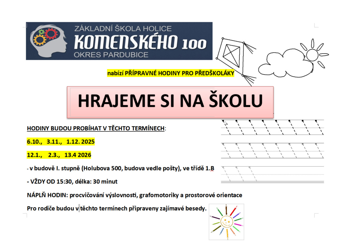 ZŠ Komenského nabízí přípravné hodiny pro předškoláky, na kterých budeme procvičovat výslovnost, grafomotoriku a prostorouv orientaci.